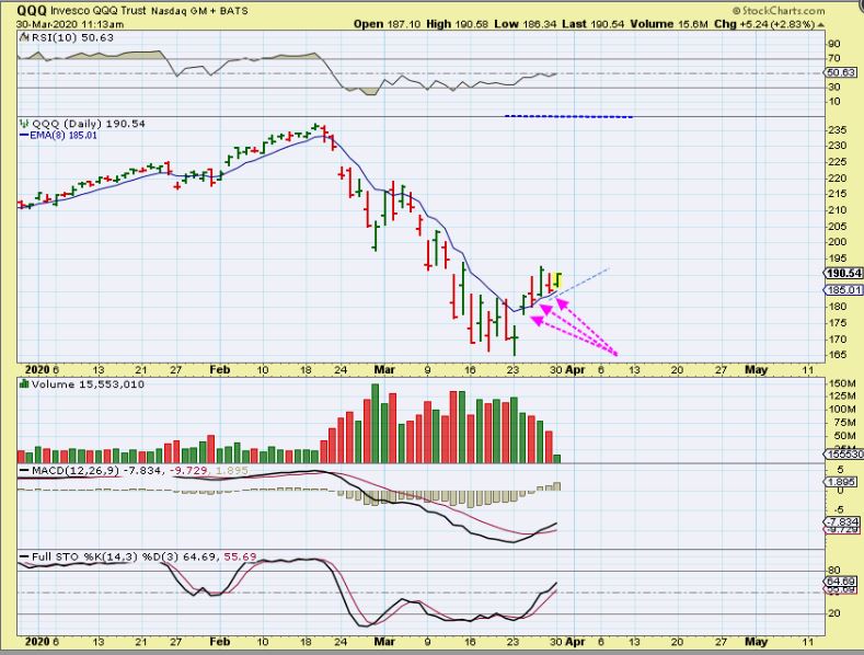 QQQ – In the morning I also mentioned that so far the QQQ was climbing up the 8 ema.  You may recall that this is what it used to do in the prior bull run.
