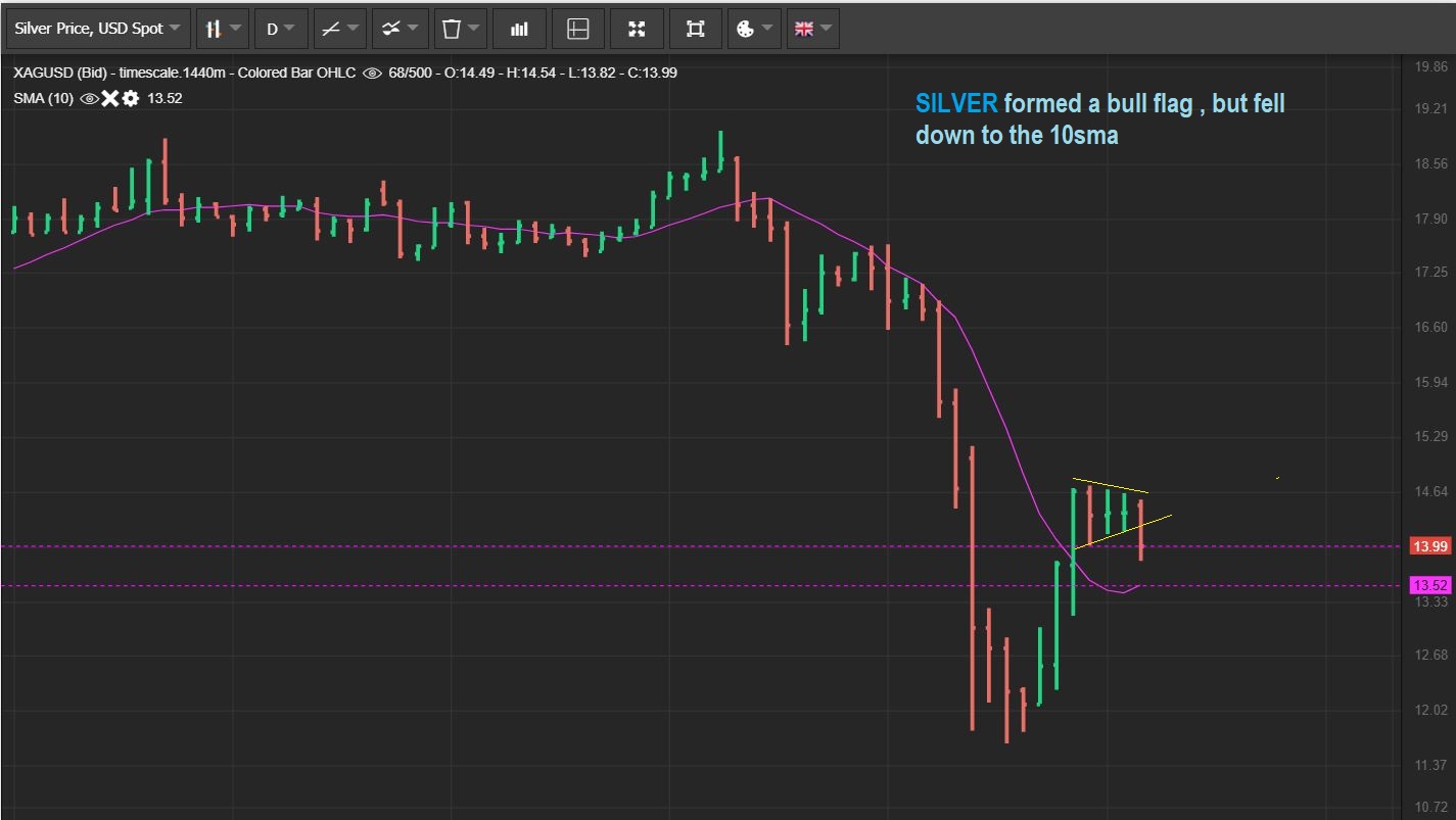 SILVER  – I thought that Silver was forming a bull flag, and it actually broke down toward the 10sma.  That isn’t in itself bearish,  just a bit short term disappointing. So now GOLD may break down to the 10sma too.