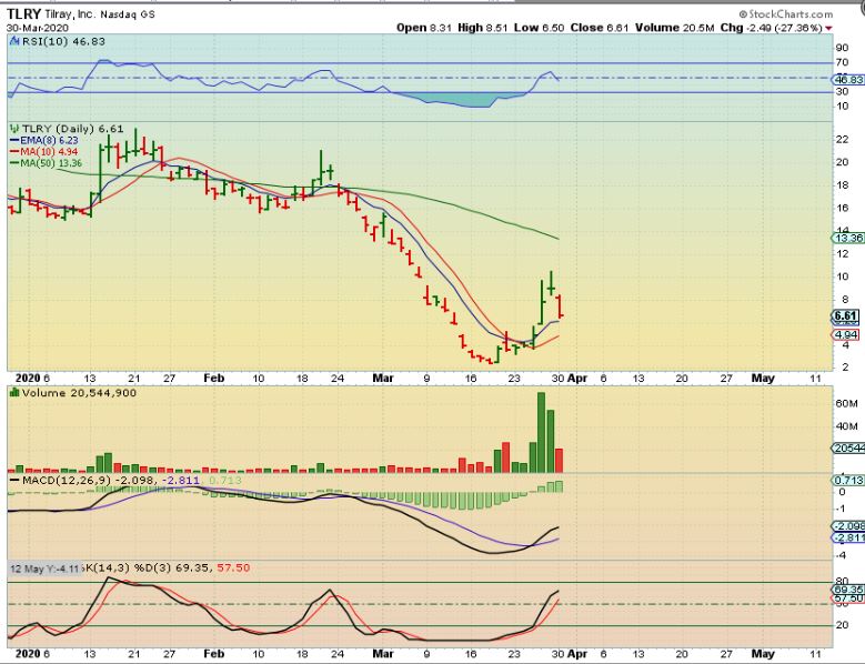 TLRY  – How about $2.50 to $8.50 in days? That was a topping candle Friday  and then it dropped 27% Monday.