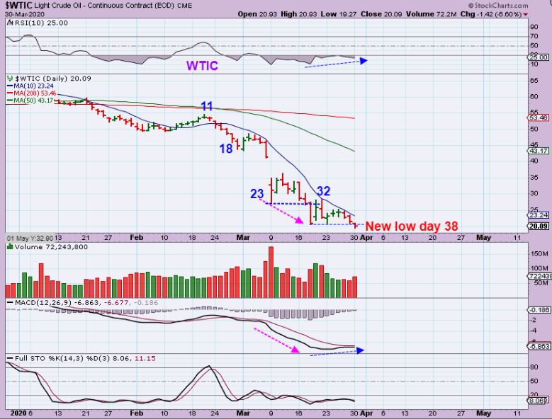 WTIC – Now on day 38, Monday saw Oil break to a new low, and we do see divergence as it broke to new lows.  With Oils new lows and a reversal, we could finally have the DCL.  It is best to Wait for confirmation, but…