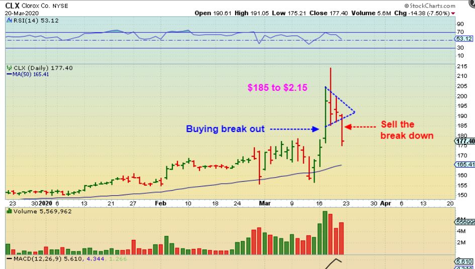 Another Example: I bought a break out Clorox, thinking the corona-virus will help Bleach / disinfectants.  I went IN at $185, rode it to $2.15, then thought it would build a bull flag, so I didn’t sell some on the way up like I usually do to lock in gains.  CLX then stopped out even on a Bull Flag break down .   I did this on several trades, but others were sold in the red after being nicely green. THIS is frustrating.