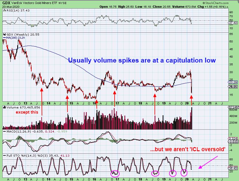 GDX – Miners crashed down over the past couple of weeks and broke the healthy chart patterns. We do have a high volume slam down, and that could be an indication of a low. I have pointed out past capitulation high volume lows as an example, and a Best Case Scenario would be an early ICL due to the sharpness  & extremeness of the sell off. We could still see a quick drop to a new low and reversal back higher next week too.