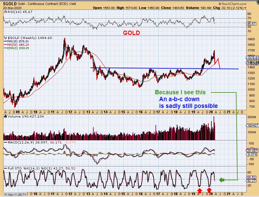 I want to conclude this report a little differently due to the current conditions.  I’m still going to conclude on a positive note, though things are rather dim at times lately, and shouldn’t be minimized with so many families worldwide being affected.  It is true, things are difficult right now, but this kind of market disruption is always temporary.  I have been through a few in my days of trading. The 2000 Tech Bubble Popped.  The Stock Markets shut down for days during the 2001 Twin Towers attack and various sectors crashed with uncertainty.    2008 was the Financial crisis. Events like those always shake things up and as dire as things seemed  ( The 2008 Financial Crisis had banks literally collapsing, massive foreclosures were rolling though neighborhoods, the economy & banking system were thought to be ready to completely collapse. people actually started building bunkers thinking that there was no way out & it would never end), but it ends.    Often there is a calming down period as the dust settles and then a Bull Rally emerges from the ashes. In 2008 it was Precious Metals first in Oct 2008 and  and then the market recovered a couple months later in 2009.   This time I think it will be the Precious metals first again, and it could be stronger than ever.   So my point is that as tough as things have become with the Virus,  I feel that it will end in a similar way after it burns its path  through this place in history. The Spanish Influenza in the early 1900’s  (google it)  ran its course of devastation, and it eventually ended too –  and modern medicine is better than things were back then.   We wait for this to run it’s course too, taking precautions along the way.    I am a trader and take trades,  but for most I have recommended more caution:  Small positions if any, maybe WAIT for the confirmed DCL’s to be safe,  and so on.  Steps like this will help us to preserve funds , so that you can take advantage of the lows when they present themselves.