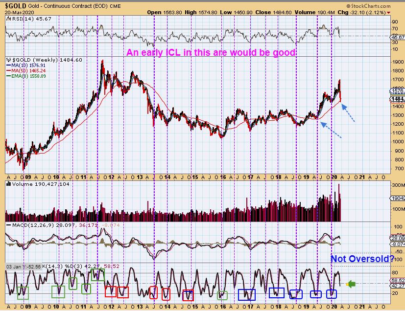 As for Oil, it has sold off very deeply too. It should be looking for an ICL soon.  With Oil, it does still seem early, since They often have 40 – 50 day daily cycles, but some Oil stocks are showing higher lows.  That may indicate that Oil will bottom early, we can’t really know for sure. Waiting for a confirmed swing low will be the signal there, and then  pretty good bounce could take place in oil & oil stocks too.