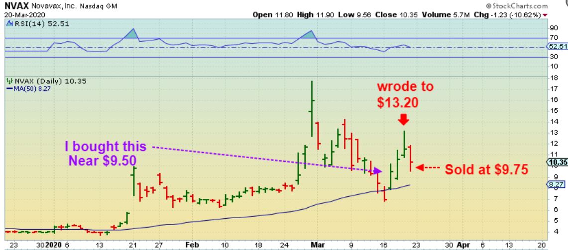 After reviewing my trades, most were very good at the start, but my losses came because I held on too long.   Even good trade set ups can roll over and become losses with this volatility.   I am still holding  SVM & AG for example, but they are currently priced under my Buy Point.   I bought NVAX and made really good gains for 2 days ( almost $4 / share!) , yet I held on & sold as a 25 cent gain/ share when stopped out).