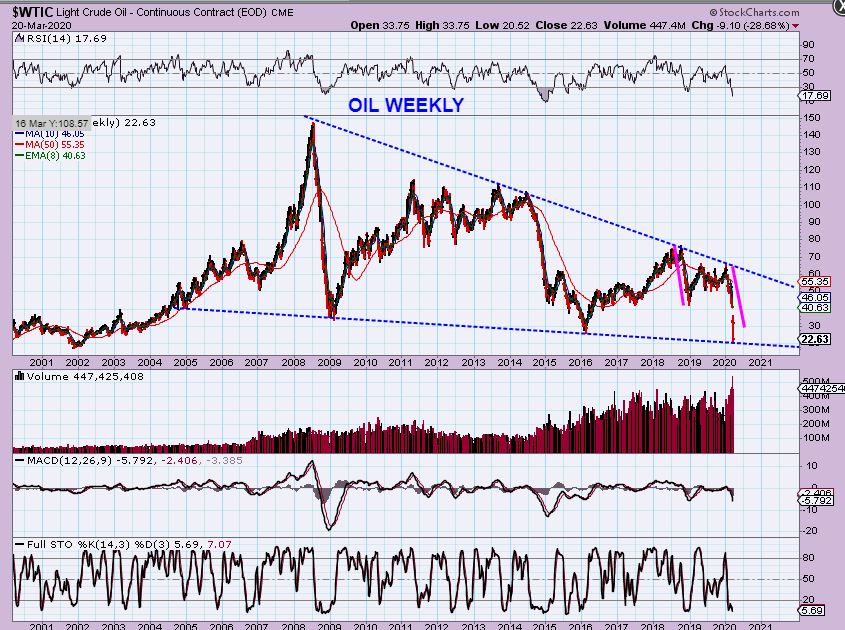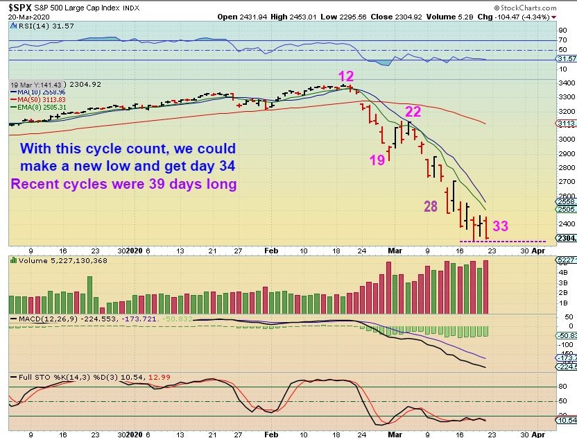 SPX WEEKLY– My expectation is that we are entering a recession. As mentioned in past reports, many small businesses could go bankrupt under the current covid19 conditions.  We can play the long side, but I’ll be ready to flip short on the bounce, looking for clues  after we enter then 2nd daily cycle.