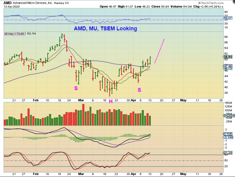 ADDING TO THE BULLISH VIEW:   I WILL SAY THIS”  AMD, TSEM, MU , etc look Bullish at this point.  I already had them as BUYS earlier with SOXL,  they are a ‘Hold” or ‘add‘  with a stop, if you ask me. That’s an inverse H&S.