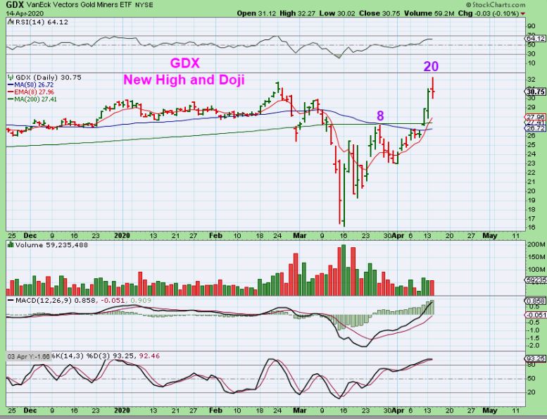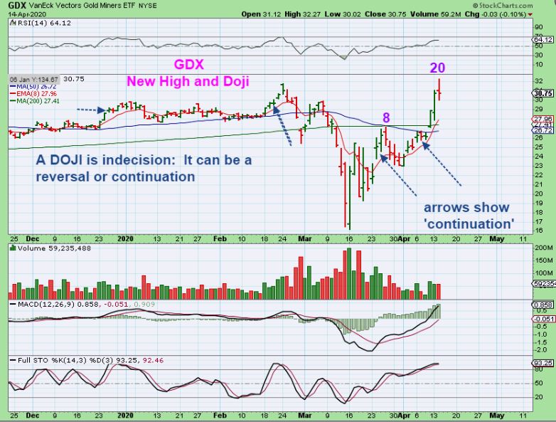 GDX  put in a new high on day 20. This is a Doji, an indecision candle, so it can pull back and then move higher, or it can also just continue higher.  Let me show you something…