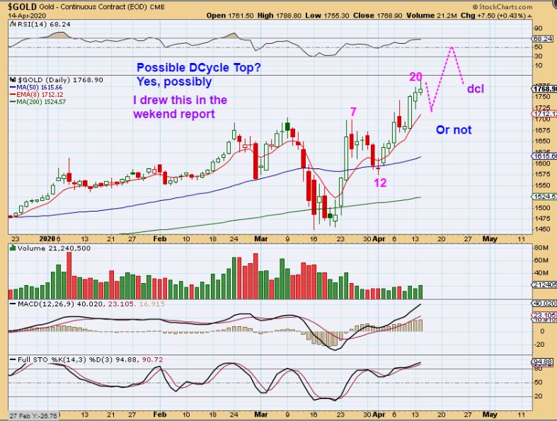 Tech stocks found buyers yesterday and the set ups remain bullish for now.  Oil is tricky. It appeared to put in lows when it broke above the 10sma after day 38, and many Oil stocks have moved well off the lows ( 100% in some cases), so a slight break of the lows with Oil is not concerning to me.  A break  could be a shake out and a day 50 dcl, rather than day 38. Gold, Silver, and Miners are Bullish. They rocketed out of the  ICL and have made tremendous gains. We have a pause on day 20, and we’ll see where we go from here.  The thing to keep in mind is that this is now a right translated daily cycle out of an ICL.  Even if we dip to a dcl, the 2nd daily cycle one should take us to even higher highs.