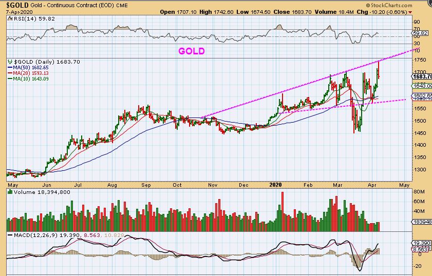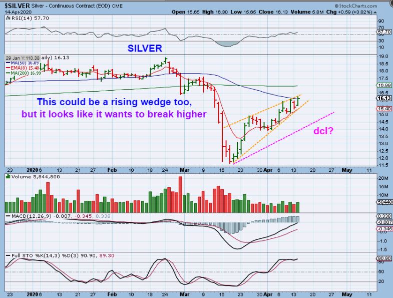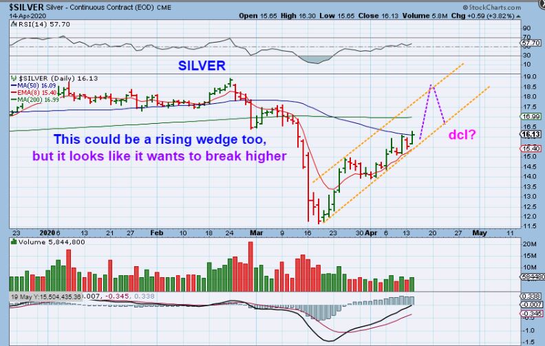 SILVER  – We had a possible rising wedge in the General Markets, but they look ready to break higher with the Nasdaq, so you could see Silver do this too. GOLD & Silver futures are down as I write, but that can change.