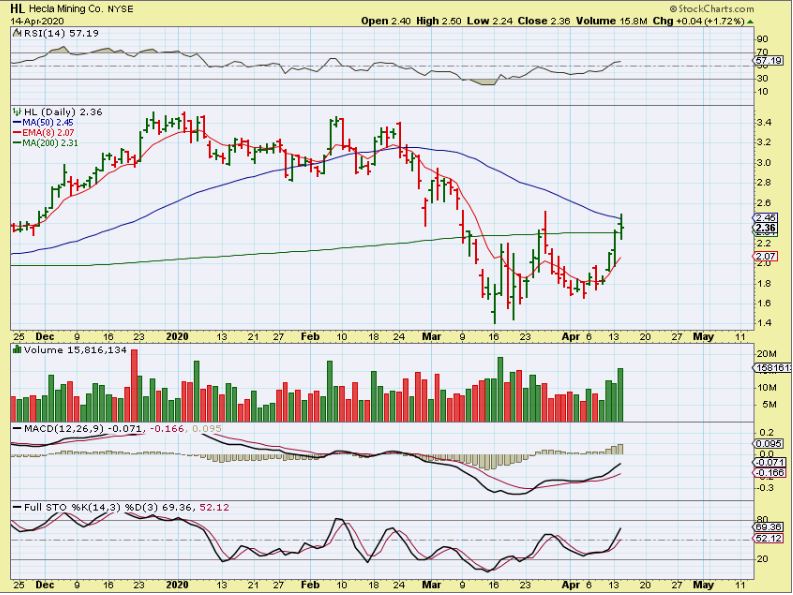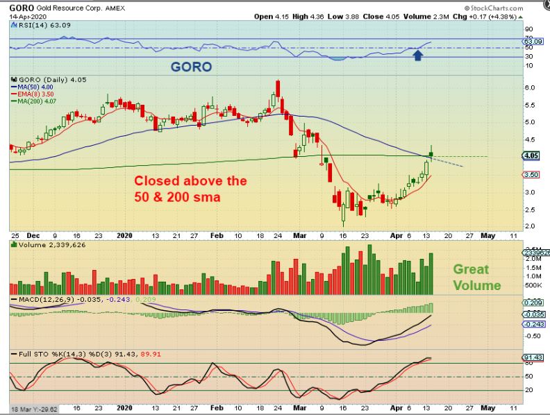 GORO is another Miners that Popped and dropped, but remains Bullishly set up and is actually right at the 50 & 200sma. If it drops to the 10sma, I will add, because volume is great and a run to $6 is 50% higher from here.