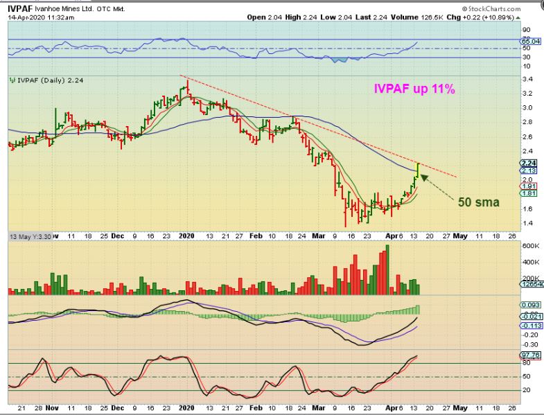 IVPAF was up 11% at the down trend line midday. It sold off a bit, but still closed up over the 50sma.