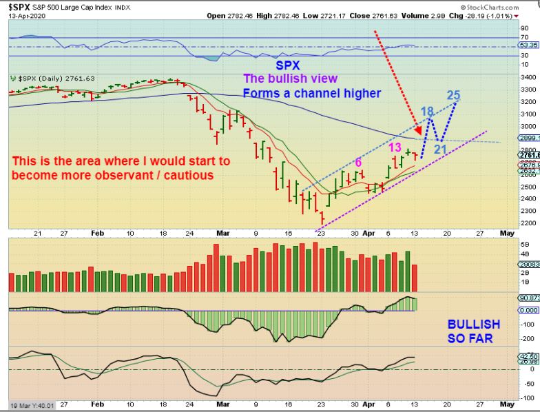 SPX – Yesterday I discussed the rising wedge ( bearish) Vs the break out higher forming a channel (Bullish). Well, we have a day 15 high and the wedge still looks valid, HOWEVER…