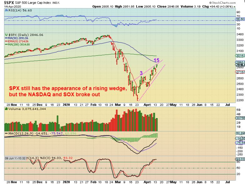 SO I WROTE THAT WE COULD SEE THIS WITH THE SPX IF THE BEAR WEDGE RESOLVED UPWARD.  WE STILL MAY GET THIS BASED ON YESTERDAYS ACTION.   Then we would no longer see a rising wedge, we could see a channel.
