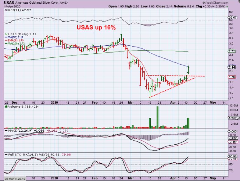 With choppy action, Individual stocks may still do their own thing.  USAS was a buy in yesterdays report as a laggard. Other Miners popped and dropped and this laggard Popped and ran, closing up 16%.