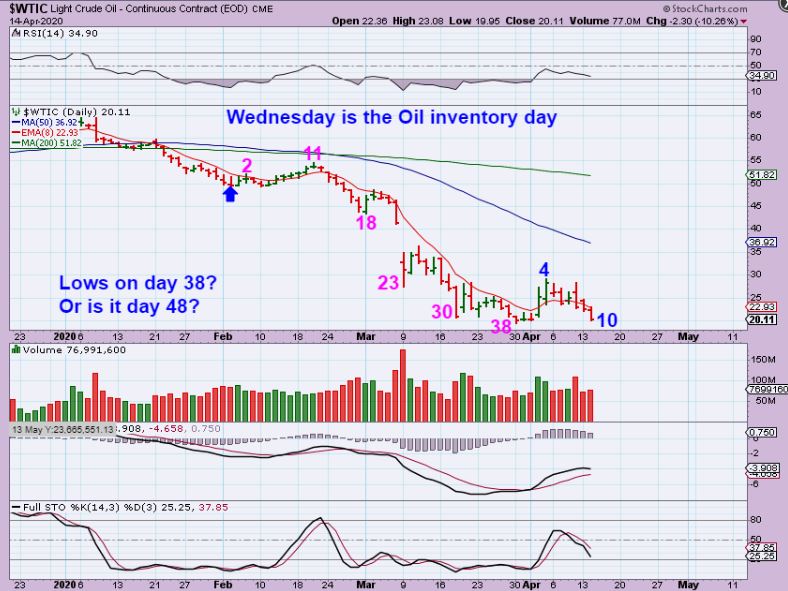 WTIC – If Oil breaks to a new low, I would have to say that this is not a day 38 low, but we’d be on day 49.  We still have very strong divergence and the Oil Stocks remained bullish, so I still believe that we are at ‘the lows’, it is just a matter of whether or not they get broken & reverse to extend the count (shake out) or not. It looks like a double bottom low with that MACD Divergence.
