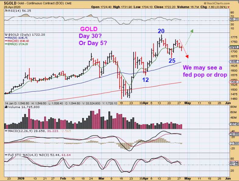 We will have the results of the Fed Mtg today, and then the full moon is due next Thursday. SOME PEOPLE feel that Lows or highs come in around  the time of a full moon, so I figured that I would just mention it since we are still due for a dip in the general markets and Precious Metals Markets. Could the FED MTG trigger a ‘peak in the general markets? That is possible.  Could it trigger a sell off in Precious metals, down into a dcl around the time of the full moon?  It’s possible.  Could the FOMC MTG trigger a rally from here, with the dcl being on day 25 for Gold last week? These are  just some things to consider as we move forward. Let’s look at our charts…