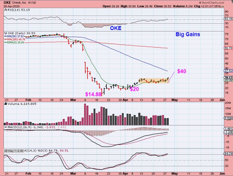 OKE is one of the Energy stocks that I traded. It already ran from $14.88 to $30 ( 100%). It was up 7% Tuesday and could be ready to run after a 2 week consolidation. We have discussed APA, MRO, XOM, BE, WTI, etc etc . They remain bullish.