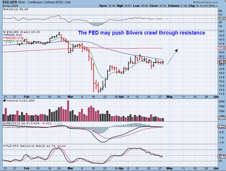SILVER  really looks like a Bullish crawl along the 50 sma. These usually break higher, the macd is solid, and Silver stocks have actually been pushing higher recently too, so this looks like it will break out higher. FED JUICE? We’ll see.