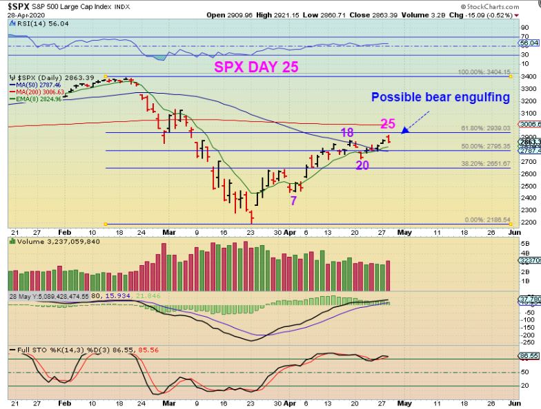 NOW I’m finding it equally hard to convince people that this may be just a ‘2 or 2.5 daily cycle bounce’ and then it may be followed by a bear market drop / down trend. This rally is convincing and the same ones that thought it could never rally or bounce with the current crisis, now think that it is SO bullish, nothing can defeat it.  The Fed is backing the rally, money is flowing, etc.