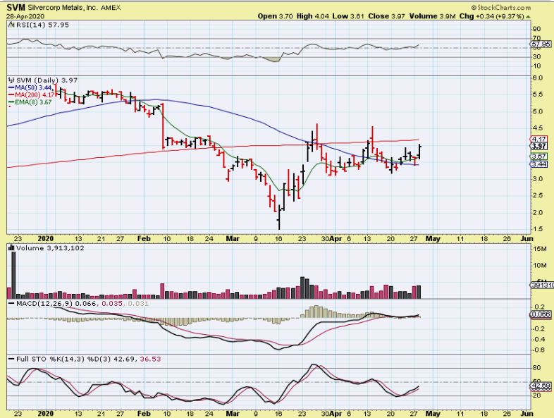 SVM – This sideways consolidation looks constructive. Price is above the 50 sma and the 200sma is overhead resistance, but that can easily be broken after a 1 month consolidation. This looks like a laggard, right? It is not near former highs yet. Well it ran up 200% in 8 days off of that low ($1.50-$4.50). This should run to $6 in time.