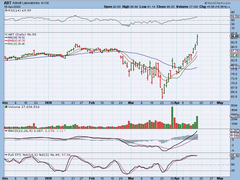 ABT – On March 30 I pointed out that Abbott labs came out with a coronavirus test that worked very quickly. It Popped and reversed lower, but…