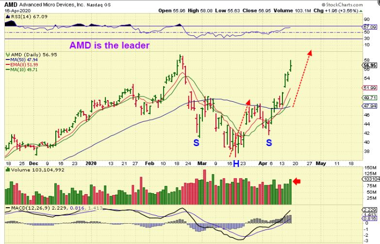 AMD then broke out and crawled along the 50sma, still a buy on April 13 as an inverse H&S pointed out here…
