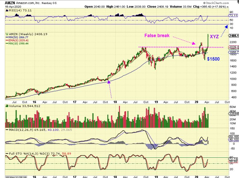 AMZN is a company that delivers on line orders, so we would have expected it to do well, but this is really a fantastic chart. Notice that AMZN actually had its crash at the end of 2019, and has simply gone sideways for over a year. Now we see a break out from a very long consolidation. If you see a bull flag form where the XYZ is, it is a BUY.