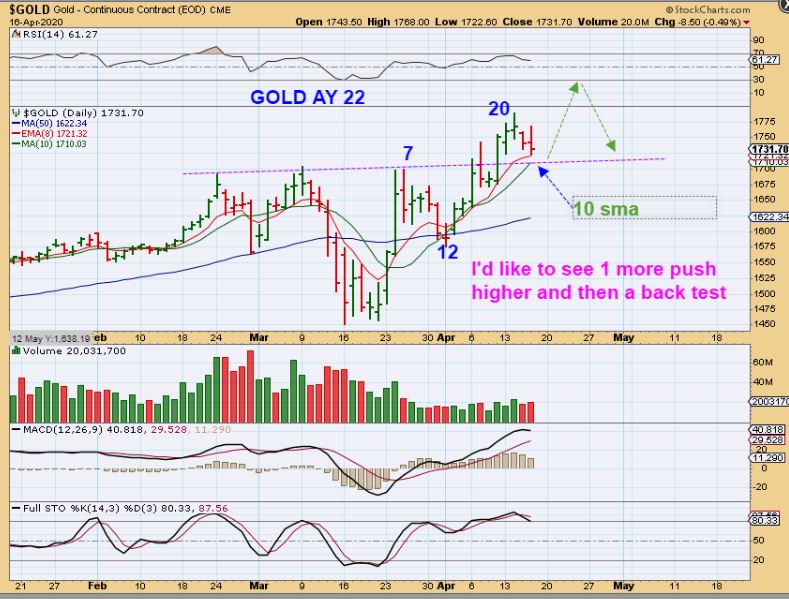 GOLD has been going sideways to the 8 ema & 10sma. I feel that we should see 1 more push higher, before a dip into a dcl, but we’ll have to wait and see. This is day 22 of what is usually roughly a 33 day daily cycle.