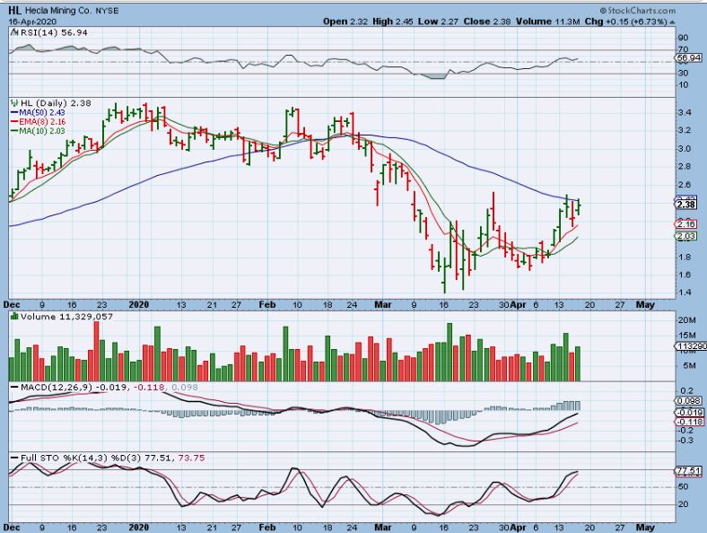 HL is another example of a Miner crawling under the 50 sma, and could be poised to break out during this first daily cycle. It may then back test the 50 sma for the dcl ( both would be buy opportunities).