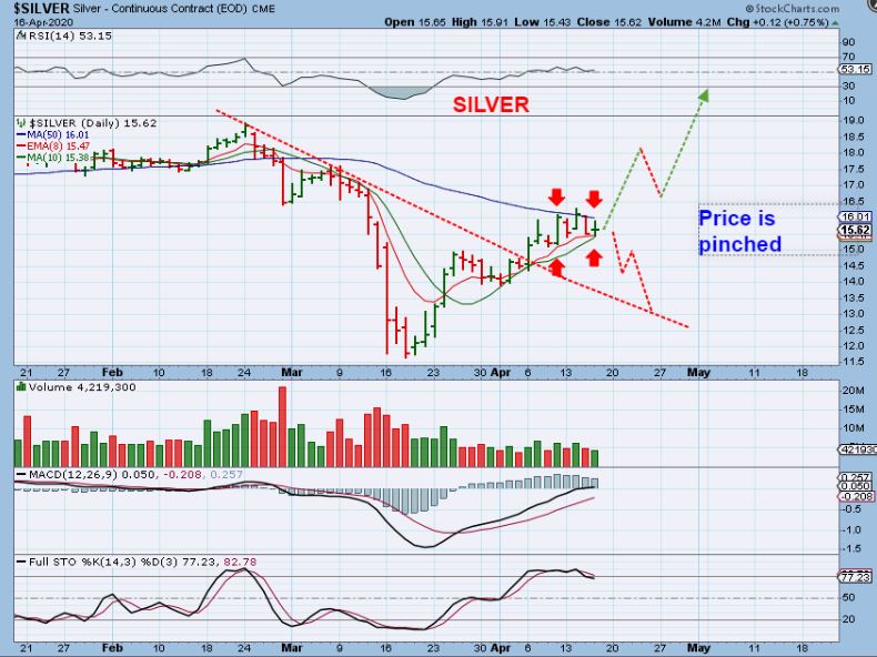 SILVER is pinched between the 10sma & 50sma, and this often leads to a break out higher. The later it gets in this daily cycle, the less chance we have of a break out, but we still have plenty of time for one now.