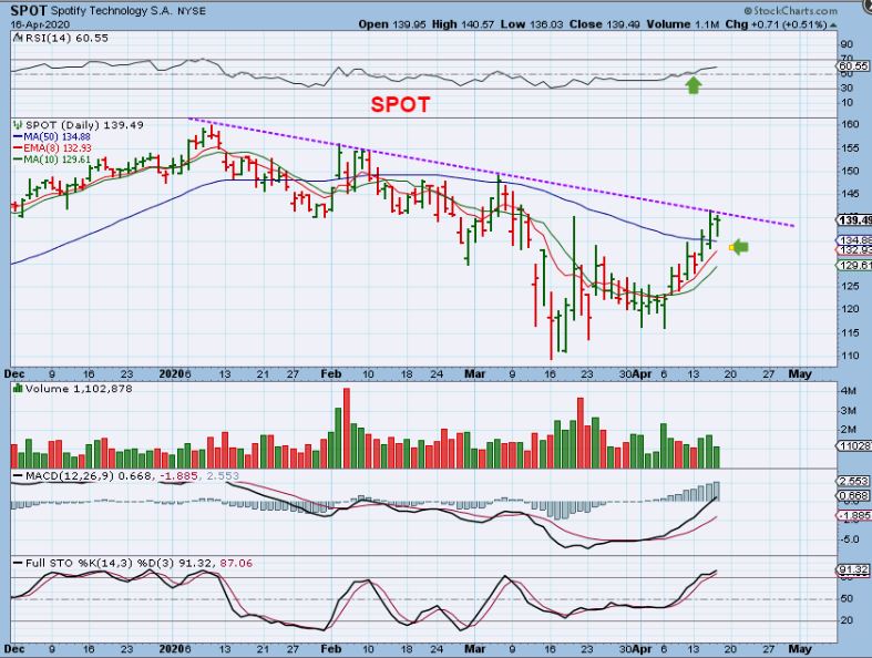 SPOTIFY is trying to break a down trend and already broke above the 50sma. This may crawl along the top of the 50sma, but if you like Spotify – this could actually be bought as a break out of the 50sma, and use the 50 as a stop.