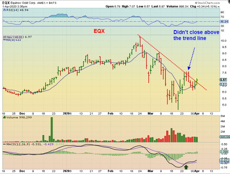 EQX – I also mentioned in the live area that I decided to buy EQX as it started to break the down trend line. A close above it would be encouraging. It then closed at $7, a bit higher from here and above that trend line. Now I just need follow through.