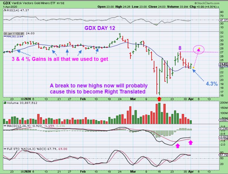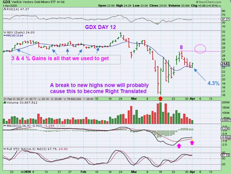 GDX Same chart – I am also pointing out that we used to get 2%-3% moves, with JNUG & NUGT moving 6-9%, but now GDX is moving with larger swings too. The MACD is bullish, the reversal at the 10sma is bullish, and a break above day 8 would be very bullish for Miners. Read the chart.
