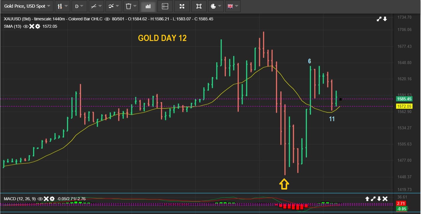 GOLD – Gold dropped toward the 10sma ( I am using the 13 sma) and on Day 12 it reversed higher, it did not sell off with the markets Wednesday. Also Remember that GOLD dropped over $40 Tuesday, and Miners did NOT Follow.
