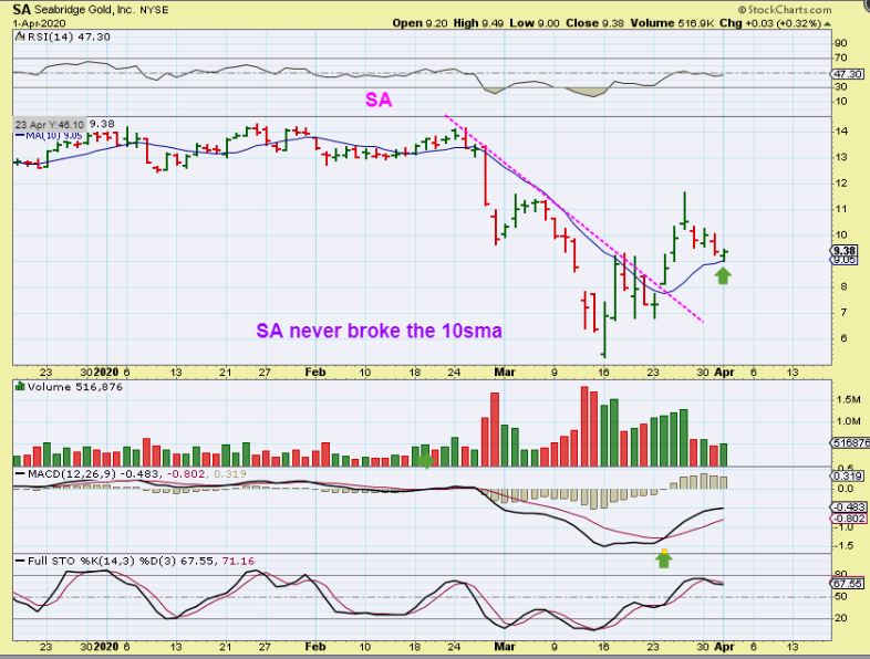 SA – This is a bullish set up. The down trend was already broken and SA only pulled back to the 10 sma. You could buy that with a tight stop.
