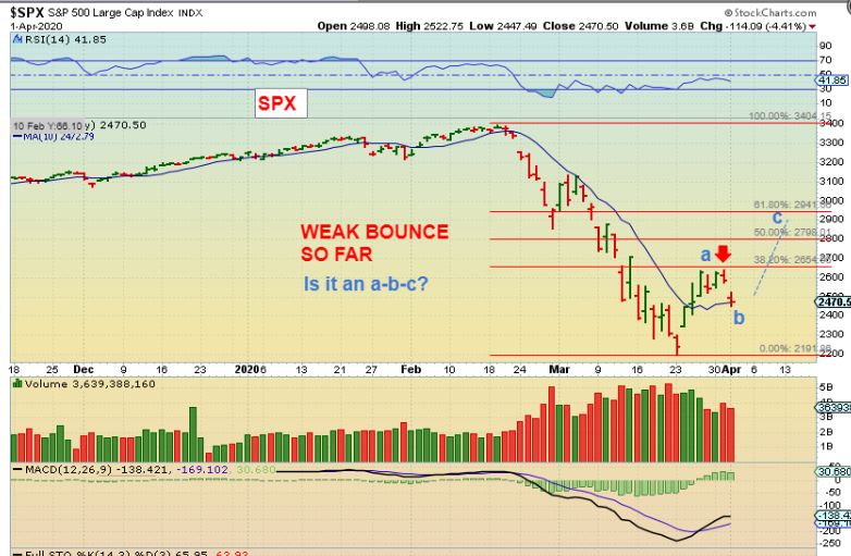SPX – At this point the bounce was a 38.2% Fib bounce. A bullish view would be that the drop to the 10sma hold price and then we could get an a-b-c bounce off of that 10sma. We could get to the ‘c’ on the chart. However: It also can break down to the gap at the lows, so use stops. Let me show you something…