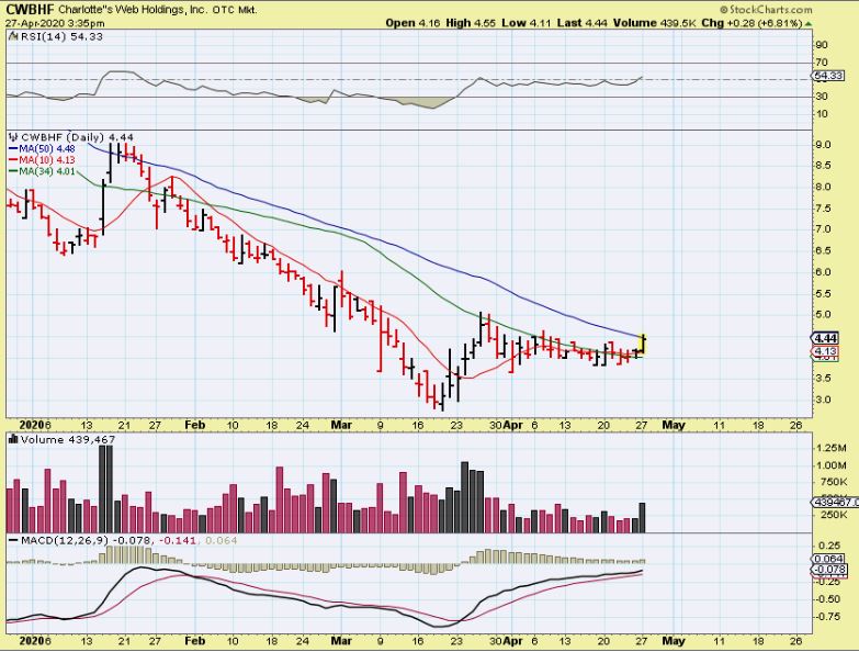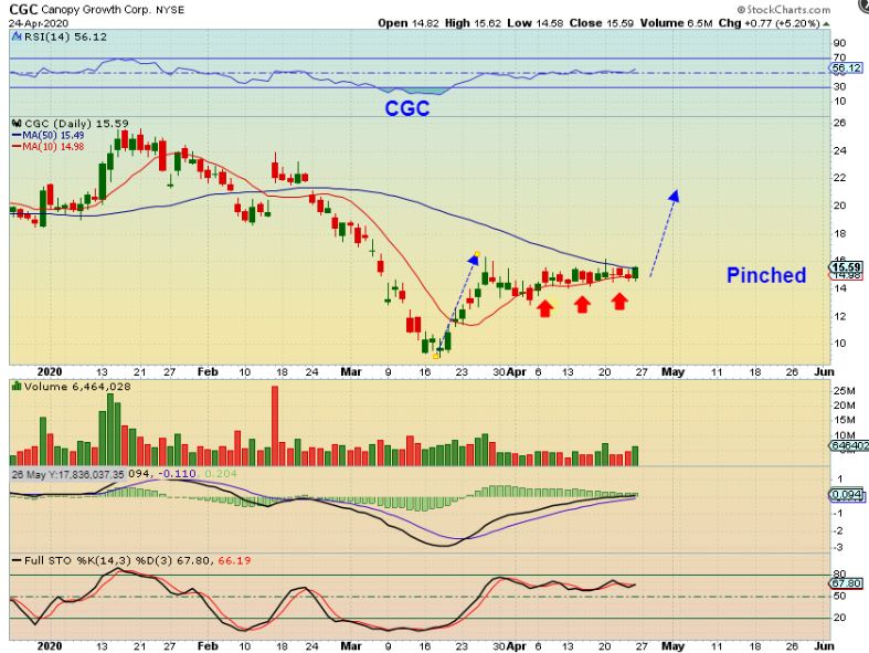 CGC – I bought this after the open when it dropped to the $15.50 area. It burst above that 50sma as expected and it closed up 12%. It ran for 6 days in march, so maybe we see something like this? I expect at least $20.