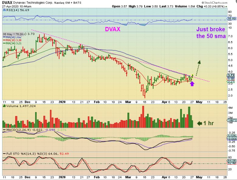 I pointed out DVAX Friday and also as it broke out through a down trend and the 50 sma Monday Morning. I bought it….