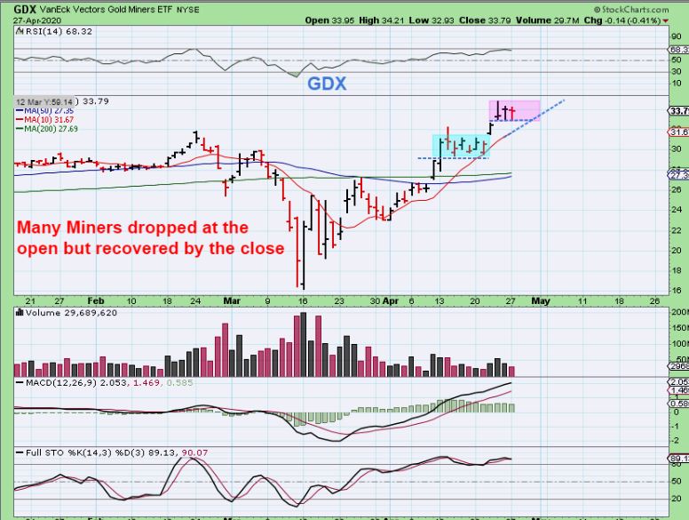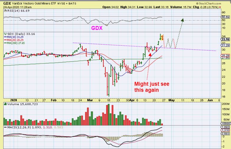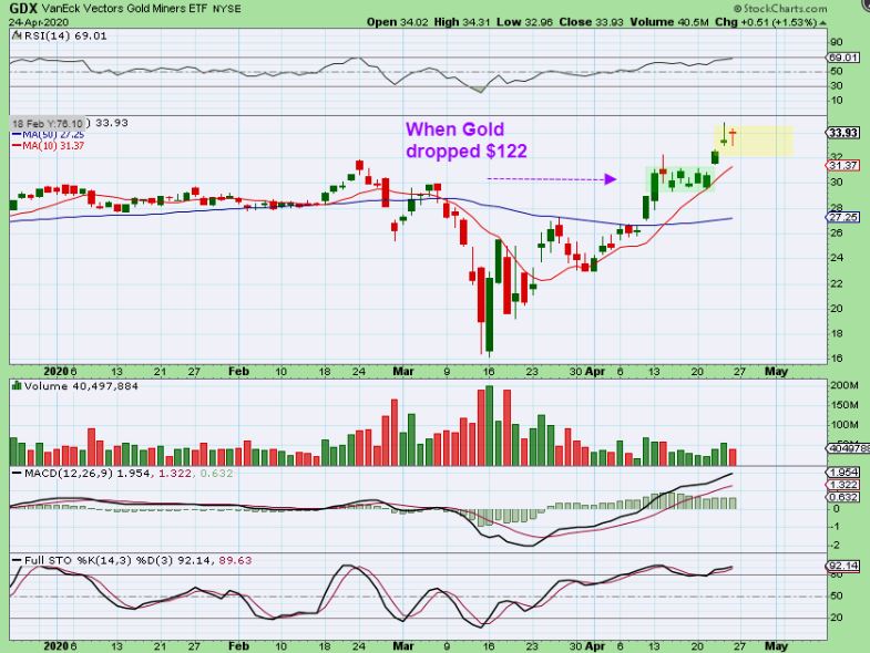 GDX APRIL 24– I mentioned that Miners might drop with Gold or they may just go sideways like they did the last time Gold dropped $122…
