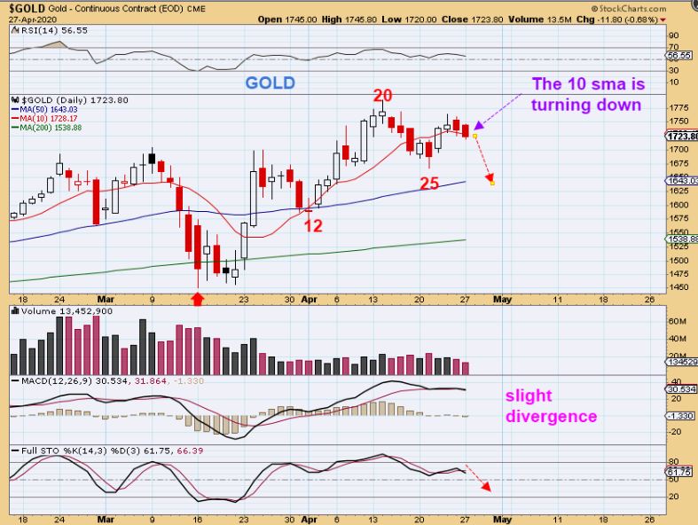 GOLD #2 (Same chart) – Day 25 has also been mentioned as a possible early dcl, but it also does not match normal criteria to me. Look at the MACD- This looks toppy. Also, I expect to see the 10sma bend down, and it is doing that right now, so this looks like the dcl drop has arrived to me. We’ll see how Miners react.