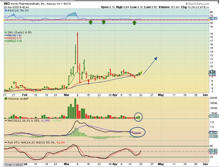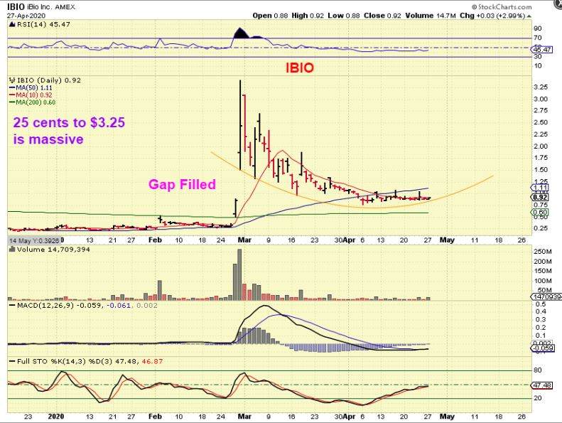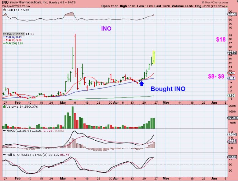 INO – Many of these Companies took off initially in March and we traded INO, NVAX, IBIO, VXRT, etc. Then they based out and this looked ready to resume the run from a base, so I said I bought this and posted it as a buy. This is April 20…