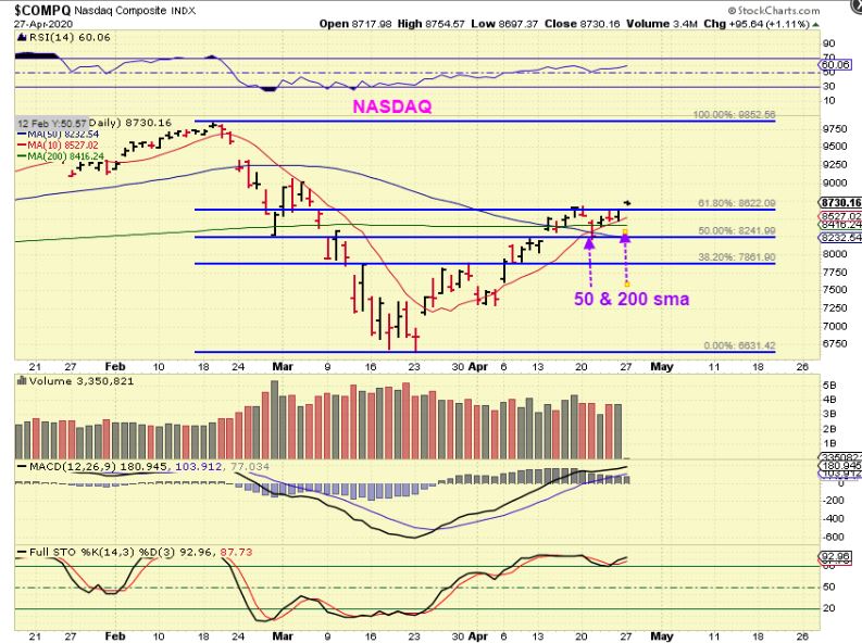 The NASDAQ already passed that 61.8 level and the 200 sma. So far our run out of the ICL is holding up well, despite the worlds economic set backs. Many stocks are doing well, we’ll see how they do with earnings. AMD is a stock doing very well, and they have earnings released this week.