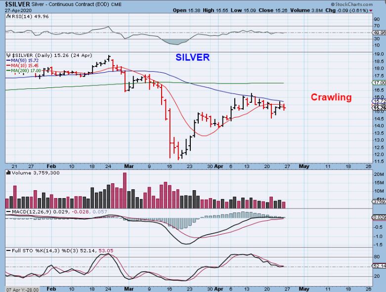 SILVER is crawling under the 50 sma and it could be building energy to not only break the 50sma, but to break the 50 sma & slice through the 200sma too. THIS could light a real fire under the Silver stocks. Silver stocks BARLEY dropped Monday and most are just going sideways. AND AS MENTIONED LAST WEEK…