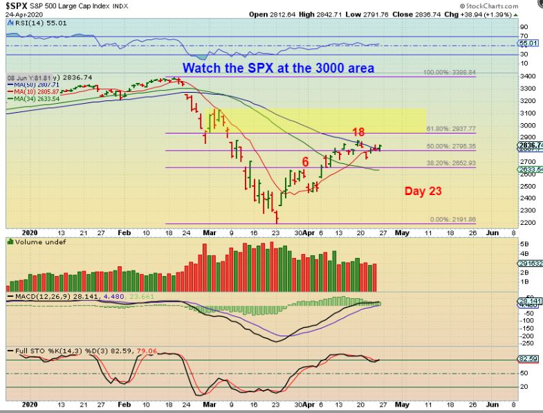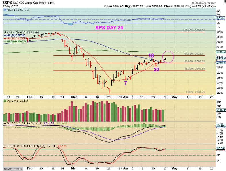 SPX – On Monday day 24 the General Markets started to continue higher, and we have a new high, making this right translated ( as expected for a first daily cycle). We’ll see how it reacts if & when it gets to the 61.8% and then the 200 sma. So far we have our bullish move out of the ICL, but check this out…
