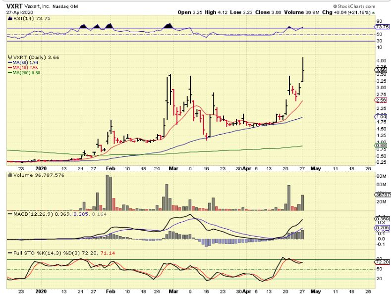 VXRT burst higher again, up 30%+ at one point, closing up 22%. I sold mine, and I may regret that, but I wanted to buy some less extended ones, So…