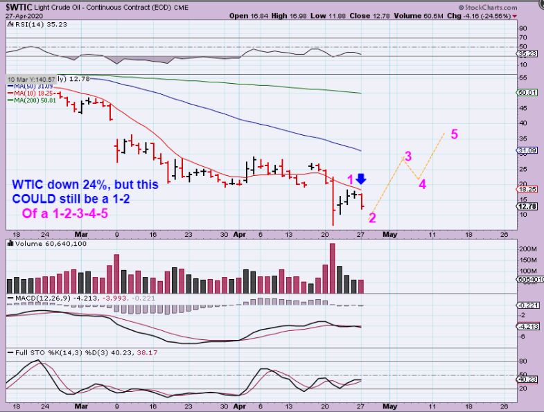 WTIC – Oil actually dropped over 25% at one point, and yet it seems normal, because many Oil stocks gapped down and ended up closing green AGAIN. SO with that, this could be a 1-2-3-4-5 move with the lows in place.