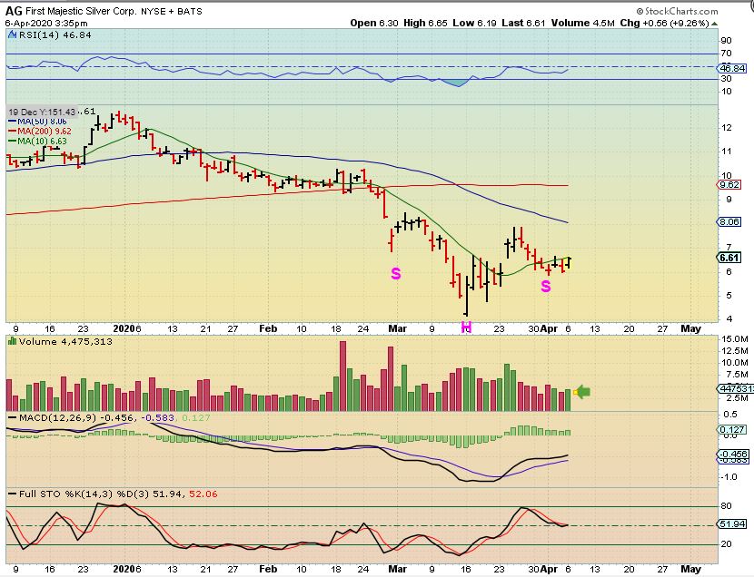 AG– This is a good silver company and if it is to move back up to where it was trading before, the gains would be great. Leaving that thought of a total recovery  aside, even just a run to the red 200sma out of an inverse H&S is $6 to almost $10 from here. Those are big gains. I own this and we’ll see how it plays out.