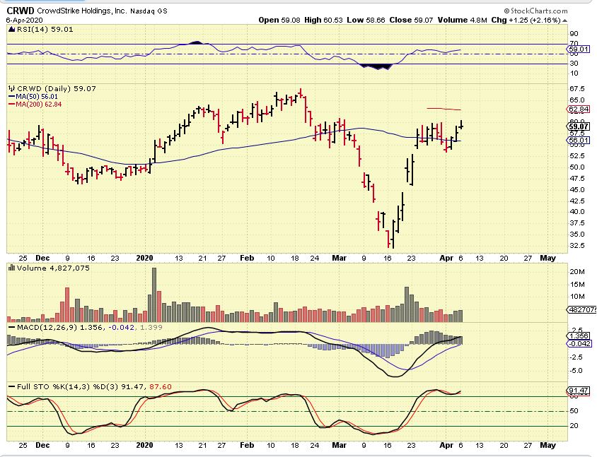 ** We traded CRWD & WORK as leaders –  Take a look at what CRWD has done. This is EXACTLY what I was talking about above, with some recovering more quickly than others.  CRWD was   Cut -In- Half  from $67.50 to $32.50, but this V-Bottom did a sling shot back near the highs. If this does an a-b-c higher, it will break to new all time highs. It has an inverse H&S  target in the low $80’s.