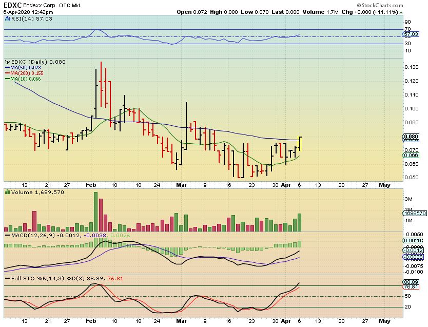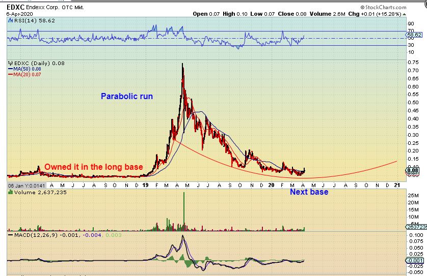 EDXC long term chart :  After a long base & parabolic run, you can get a new base that forms and eventually steadily works its way back to the former highs if the company is still doing ok.   The Pop yesterday was due to thier earnings report.  I may try to hold this new position for a while, even though it may not be quite ready yet.  It can be choppy, since I may be right at the lows, but it is cheap and the RISK REWARD has returned to what it was when it ran from $0.06 to $0.75 in 2019.